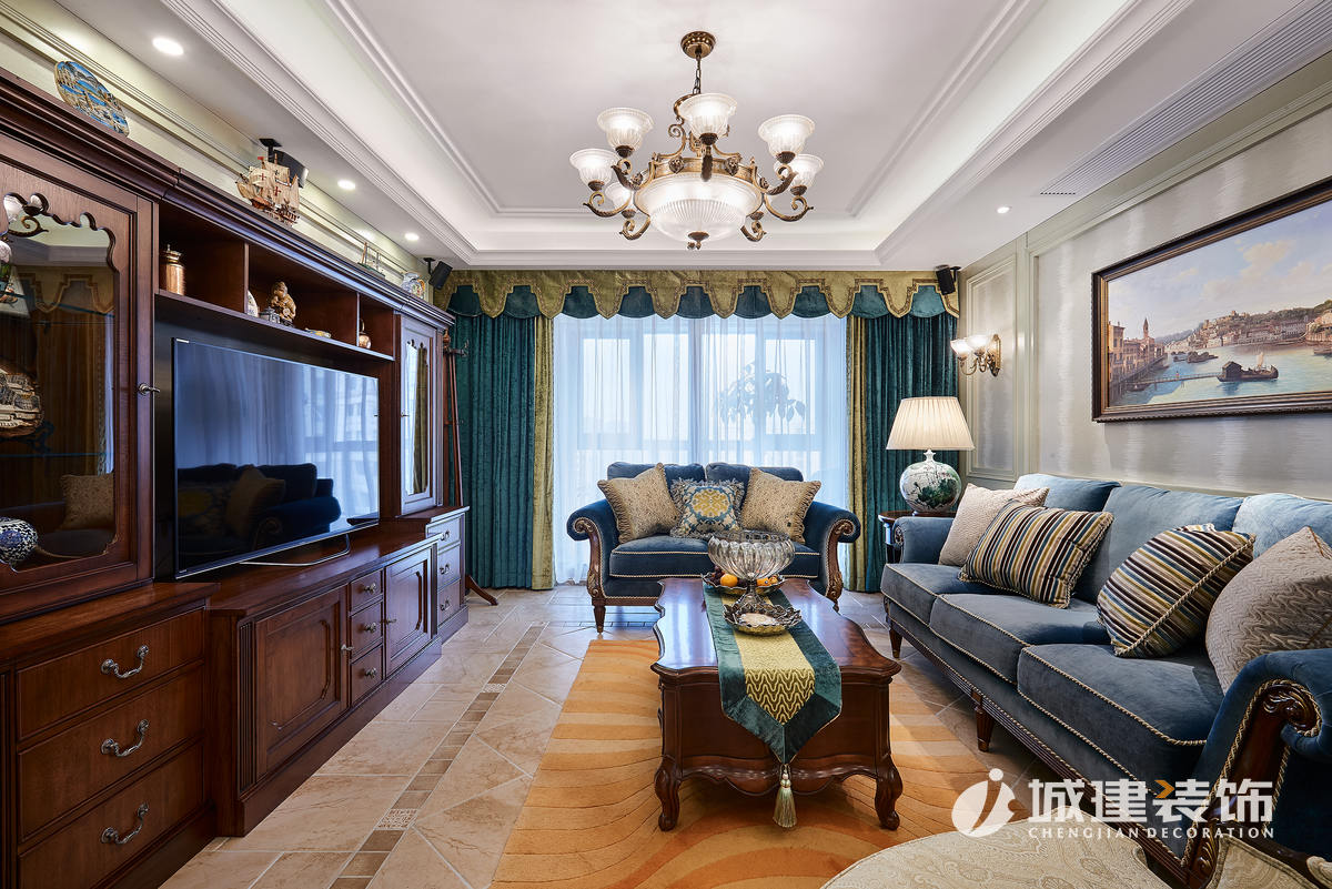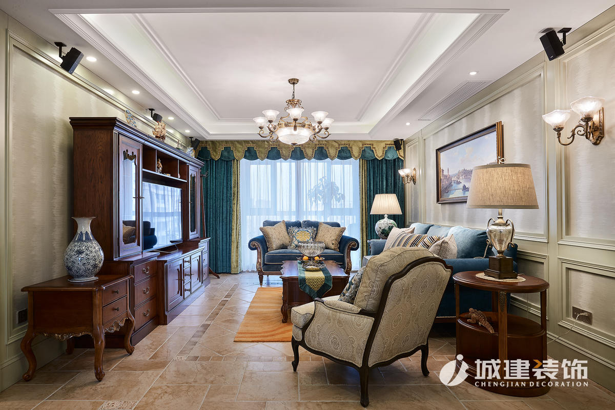 客廳護墻板定制了溫柔的淺綠色,搭配米色仿古地磚 ,電視背景選用了美式組合柜,整個空間層次搭配的條理有序,低奢氣質盡顯。將客廳與主臥的陽臺打通,打造溫馨休閑區(qū):溫暖的午后,坐在這兒看看遠處的風景,聊聊天,喝喝下午茶,好不愜意。