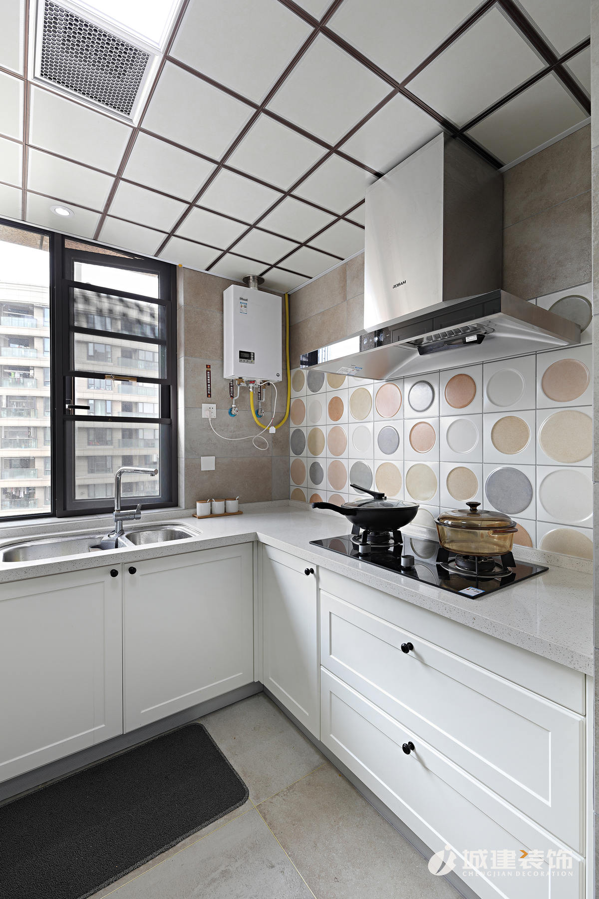 廚房以白色淺色系為主,保持與客廳的整體性。主衛(wèi)以簡潔雅致的灰白藍(lán)色調(diào)為主,客衛(wèi)采用干濕分離,實(shí)用為主。