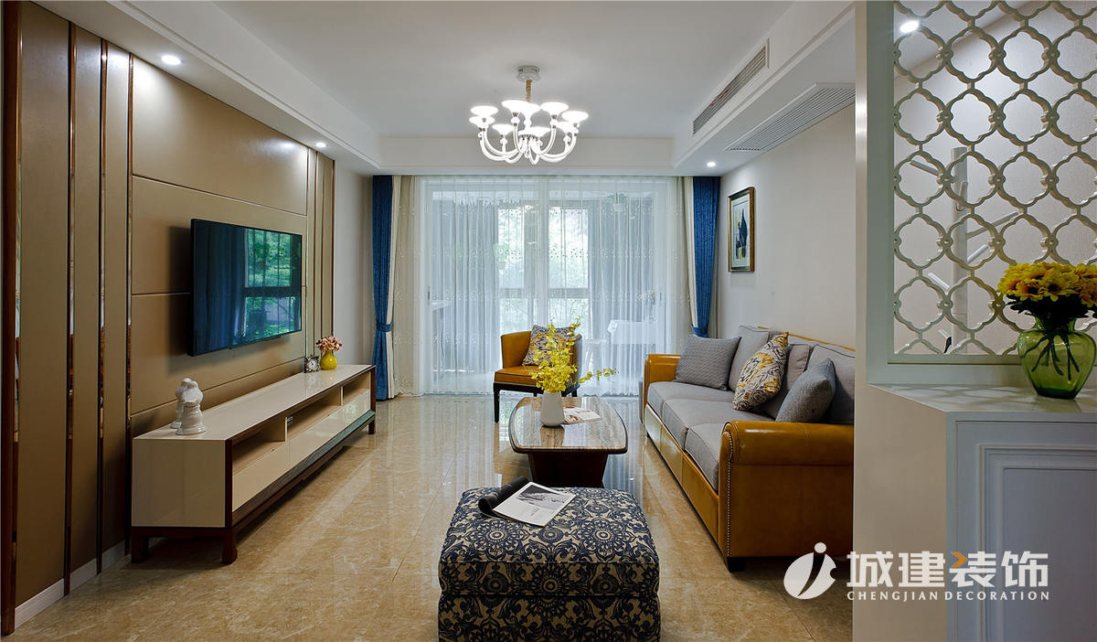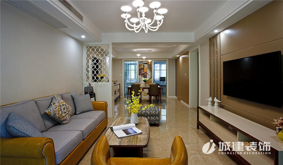 客廳以米白色為基調(diào),沒有花哨的裝飾,電視背景墻也是大色塊線條,與沙發(fā)背景墻相對應,簡約不失時尚。