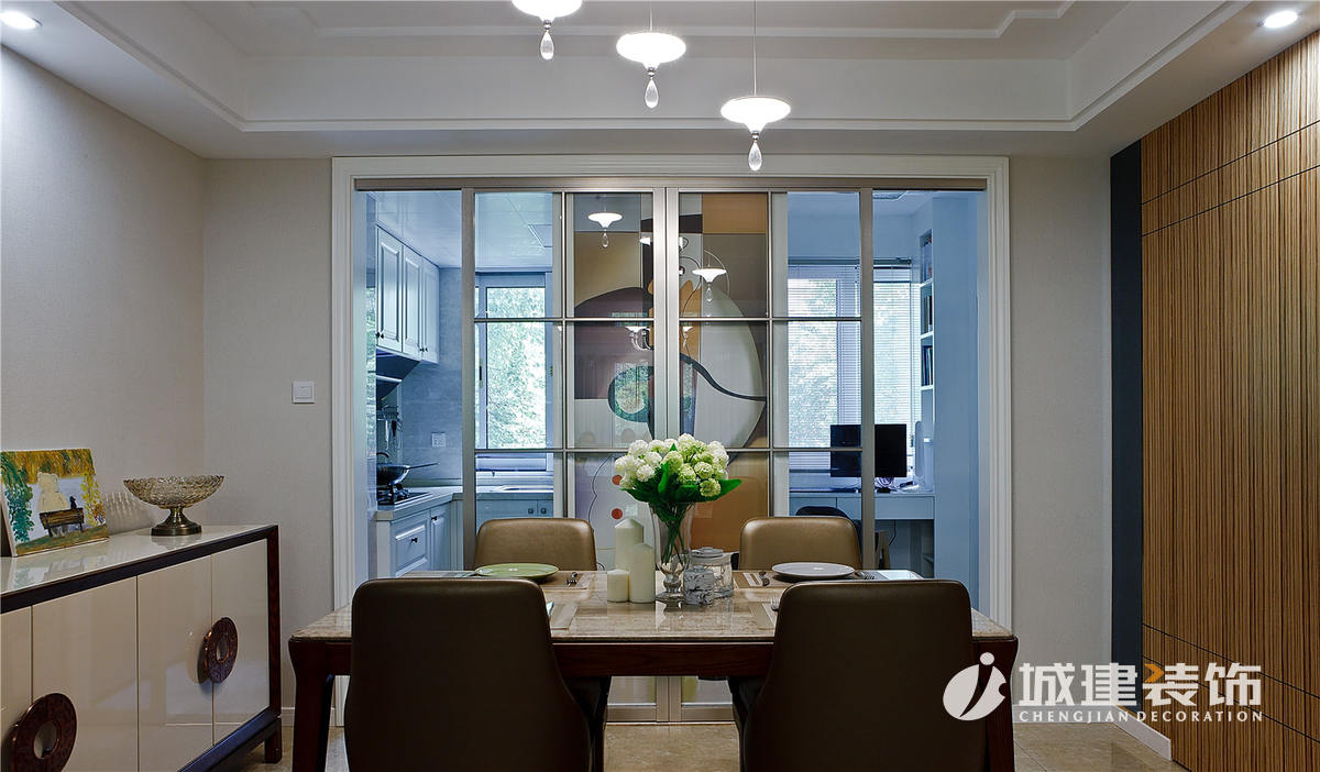 餐廳與廚房相鄰,選擇了玻璃移門,讓屋外的光線透進來,提亮整個餐廳的亮度。設計師在這塊區(qū)域花了好多心思,在廚房右邊隔了一個小書房,兩者之間用藝術墻做裝飾,時尚個性。書房一邊的墻面裝了大塊鏡子,延伸了這個小空間。