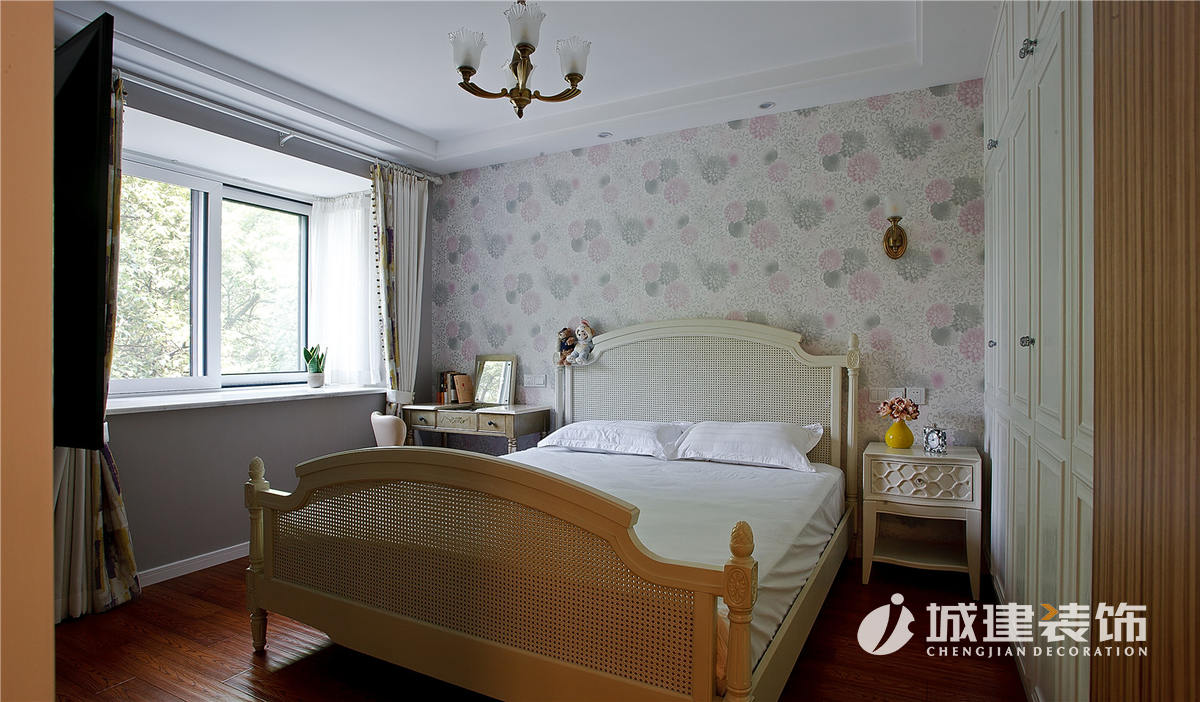 主臥和女兒房都以清新淡雅為主,主臥顏色更休閑穩(wěn)重,做了走入式的小衣帽間,移門顏色與墻面相呼應。女兒房選擇了爛漫的花卉壁紙,做了整體白色的衣柜,包括梳妝臺和床頭柜都是精心挑選,精致美麗。