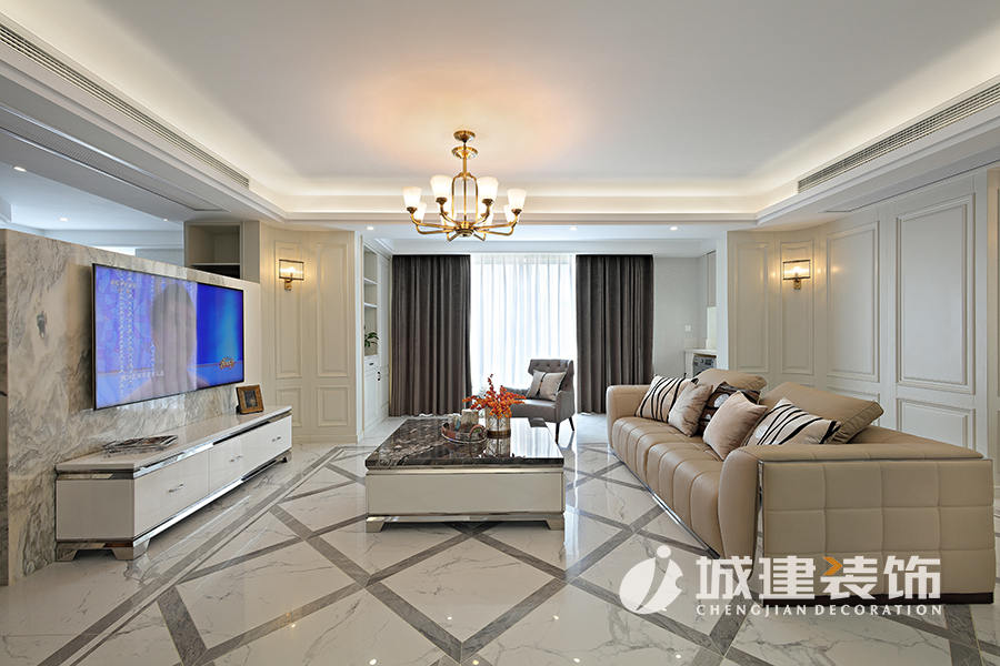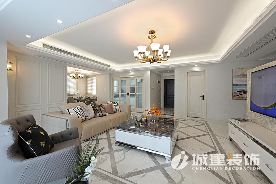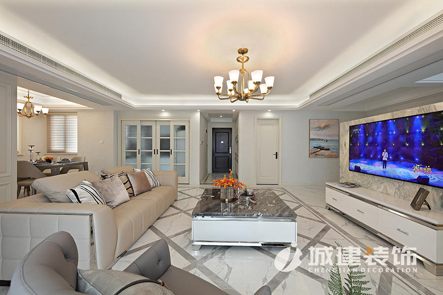 近而不浮,遠(yuǎn)而不盡。白色為主色調(diào),營造了一個(gè)純凈的氛圍,若隱若現(xiàn)的室外景觀給人以遐想,電視背景墻山水中式元素與現(xiàn)代材質(zhì)巧妙兼容,再現(xiàn)了移步變景的精妙小品。大面積白色造型墻與灰色墻紙搭配,沉穩(wěn)氣息撲面而來,半高電視墻巧妙地利用了墻體的空間,使空間看上去更為寬敞,茶幾黑色的大理石材磚讓這個(gè)空間顯得更加沉穩(wěn)。黑色大理石臺(tái)面和周圍燈具金色金屬質(zhì)感結(jié)合完美的和電視墻完美呼應(yīng),賦予空間溫暖的質(zhì)感。