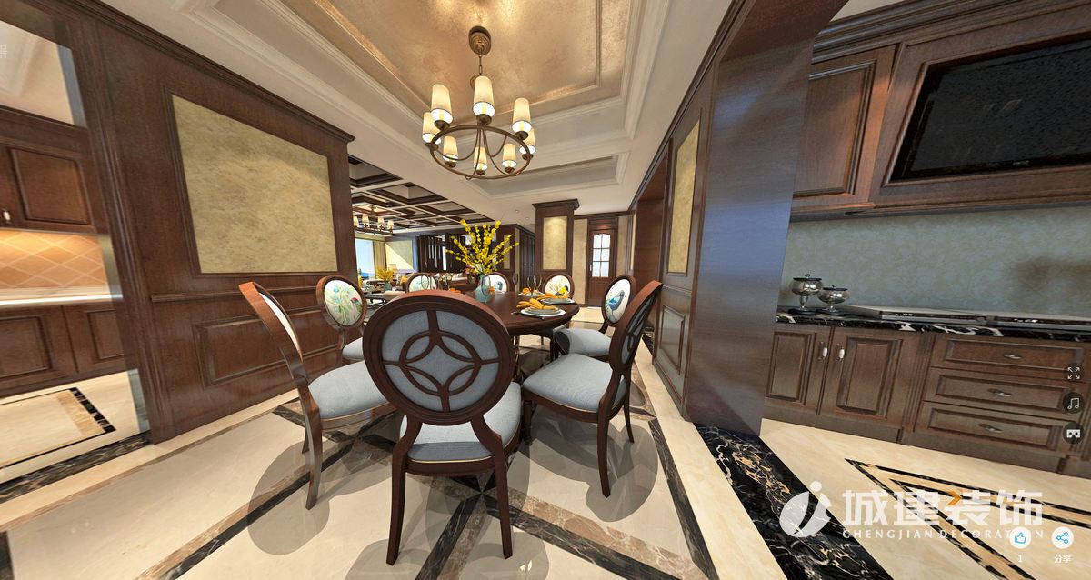 本案采用美式風(fēng)格,講究是如何通過生活經(jīng)歷去累積自己對藝術(shù)的啟發(fā)及對品味的喜好,從中摸索出獨一無二的美學(xué)空間。家居自由隨意,簡潔懷舊,使用舒適。暗棕,米黃為主的自然色彩。古典家具簡單化。地面拼花與頂面吊頂裝飾相呼應(yīng),同時采用木飾面護墻裝飾板,墻紙使整個空間更具美感,讓家庭成為釋放壓力和解放心靈的凈土。