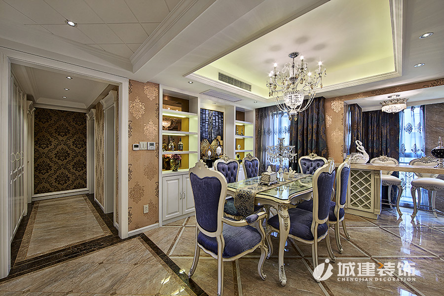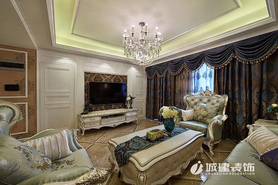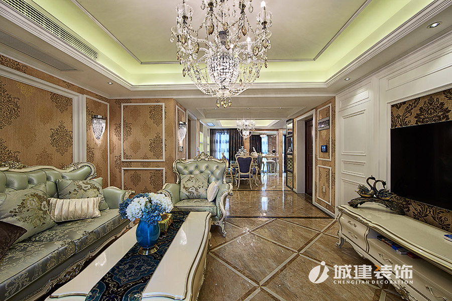 本案是一個三口之家,業(yè)主喜歡歐式的優(yōu)雅與奢華,因此采用歐式裝修風(fēng)格,通過水晶吊燈、壁燈、以及擺放的小飾品來營造出優(yōu)雅的氛圍,地磚、背景墻、吊頂?shù)炔糠謩t能表現(xiàn)出歐式的奢華。