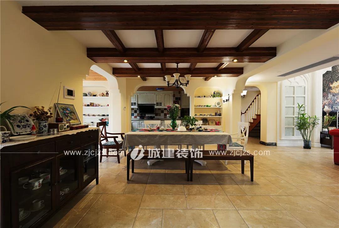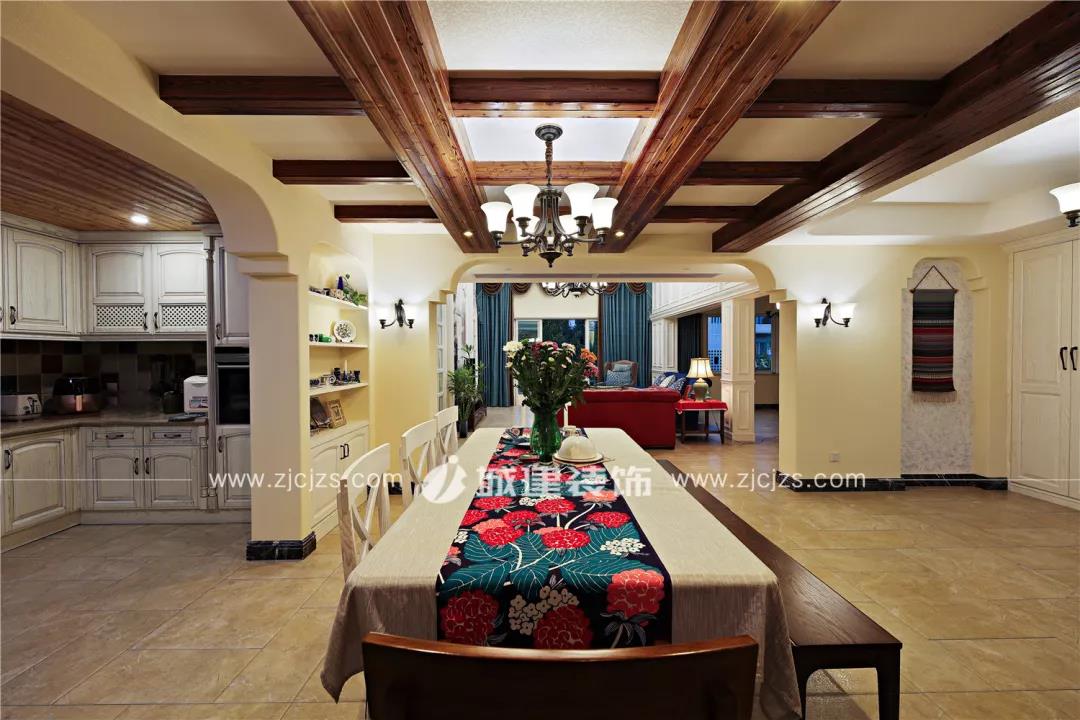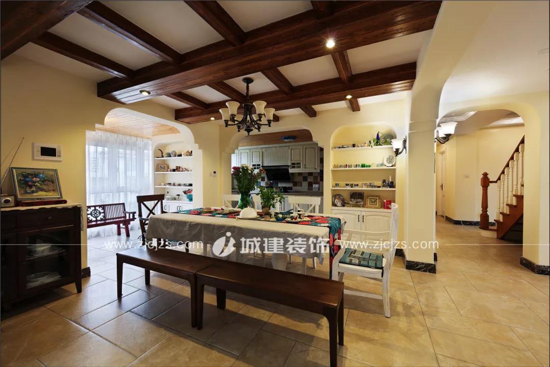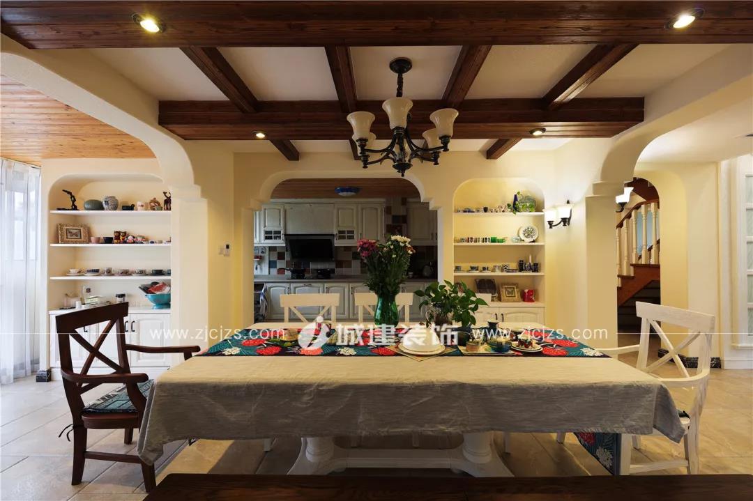 經(jīng)過(guò)玄關(guān)進(jìn)來(lái)便是餐廳。餐廳頂部沿用素白色調(diào)搭配橫梁木裝飾,該空間作為玄關(guān)、廚房、客廳的轉(zhuǎn)承區(qū)域,每個(gè)銜接通道都設(shè)計(jì)成特色拱門,區(qū)域內(nèi)留白部分也設(shè)計(jì)了或大或小的造型墻并以硅藻泥飾面,整個(gè)空間風(fēng)格統(tǒng)一卻又不失層次。