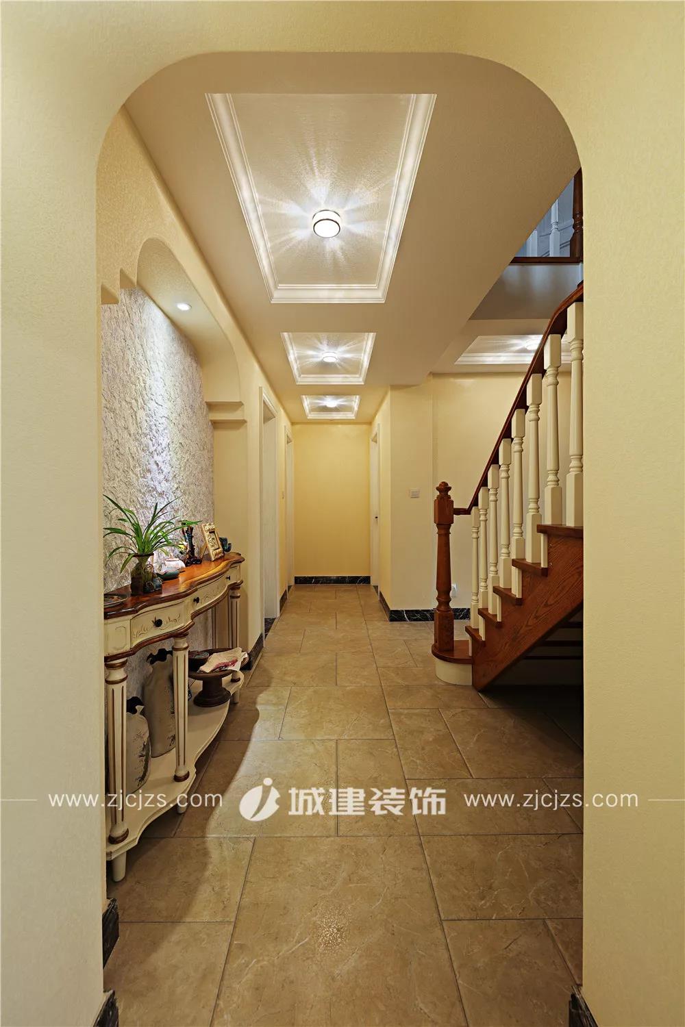 客廳往里走,過(guò)道一側(cè)做了一面硅藻泥墻面,搭配一件做舊復(fù)古的端景柜,在這個(gè)家里隨意走到一處皆風(fēng)景。端景柜對(duì)著的是通往二層的樓梯,上方懸掛著精致吊燈,鄉(xiāng)村美式便是如此。
