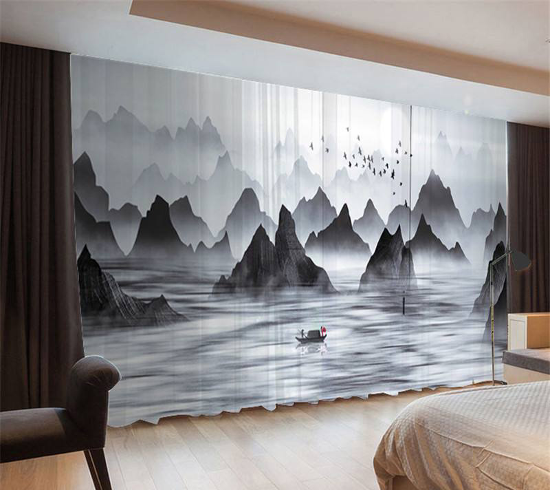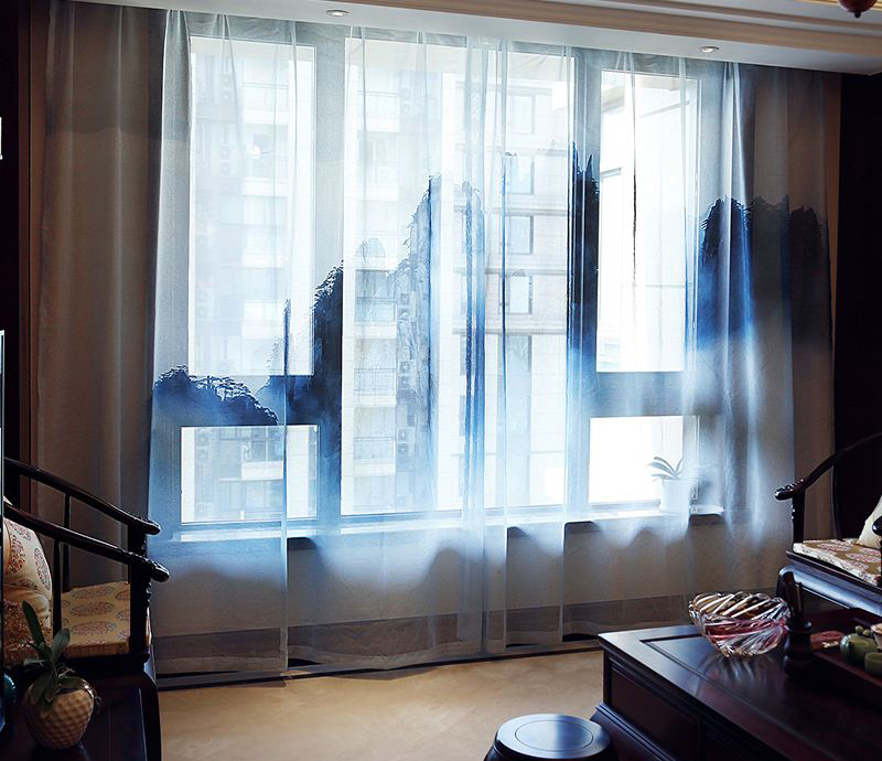 軟裝飾品中,窗簾也是很具備裝飾性的一款材料,窗紗一般我們都使用透明度較高的白色窗紗,沒有過多的形式,但大家有沒有想過將它換成山水畫窗紗呢?就像下面這張圖片一樣,既不影響窗紗的使用性,同時感覺這個部分就像一幅畫一樣,為家居增添很好的美感,讓空間更加的靈動有韻味。