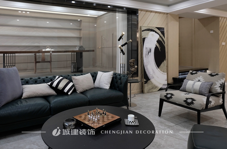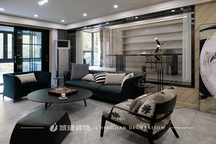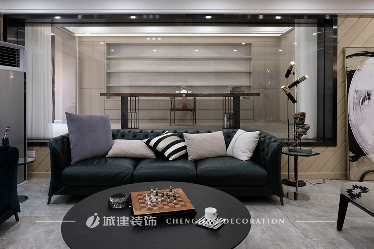 因?yàn)閷痈叩脑?,原先屋?nèi)光線比較暗,設(shè)計(jì)師將客廳與書房中間的墻面打通,采用玻璃幕墻,這樣兩個(gè)空間形成“光線互借”,提高屋內(nèi)的采光。