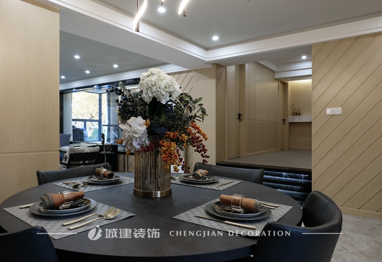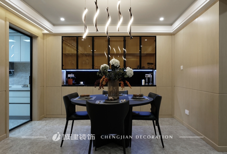 黑色圓餐桌,搭配律動(dòng)時(shí)尚的吊燈,活力卻不張揚(yáng);餐邊柜部分采用玻璃柜門,與用餐區(qū)相呼應(yīng),豐富空間元素。