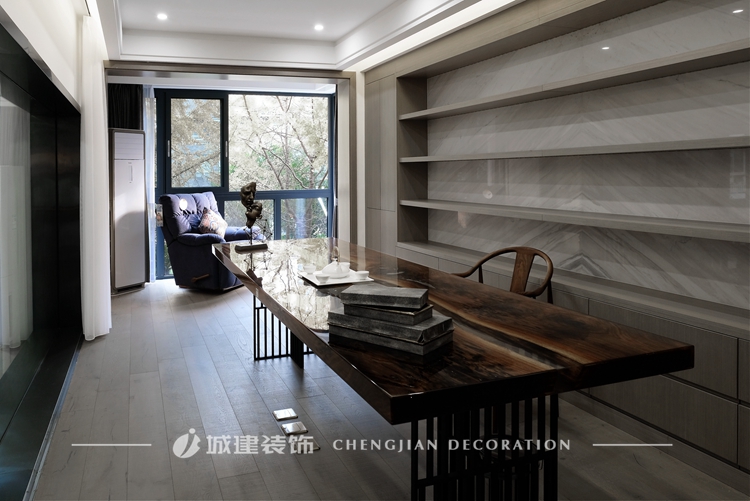 書房做了整面的柜子,書桌背面采用開放式書柜,大理石裝飾墻面,與客廳電視背景墻相對(duì)應(yīng)。極簡(jiǎn)的空間,極好的采光,營(yíng)造最佳的閱讀、工作氛圍。