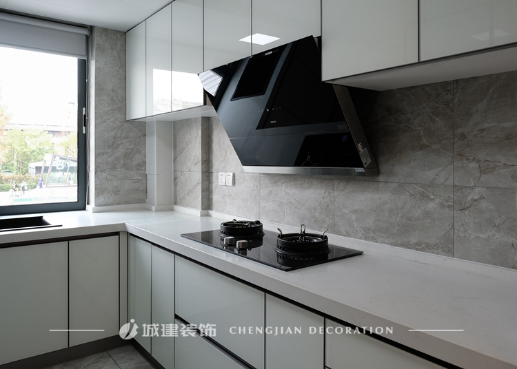 白色亮面櫥柜,黑色線條點(diǎn)綴,搭配灰色花紋瓷磚,讓廚房時(shí)尚靚麗。