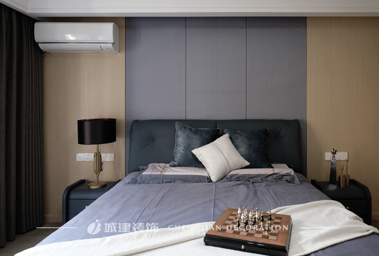 臥室同樣簡(jiǎn)約風(fēng)格,選擇溫柔的香芋紫與木飾面搭配,溫馨靜謐