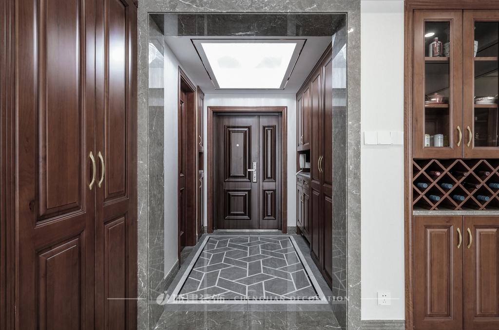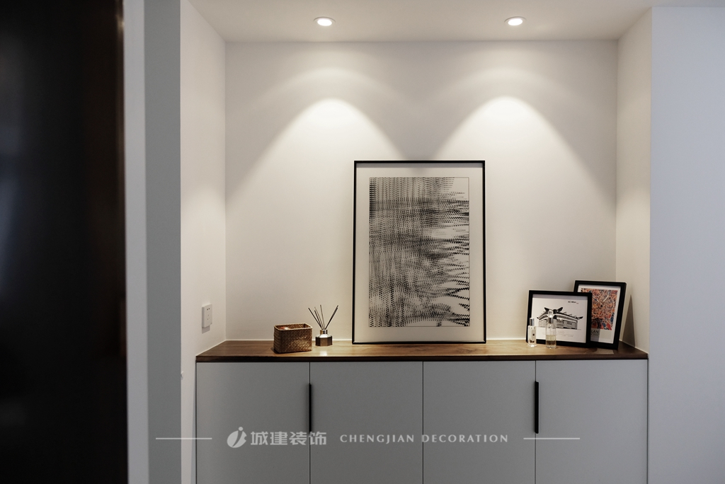 玄關(guān)空間通常較小,可以用筒燈作為主要照明,根據(jù)實際需求添加局部光源,如在穿鞋區(qū)、鞋柜開放隔層上可以加一些射燈、筒燈或燈帶做重點照明,這樣找鞋、拿東西更為便捷。