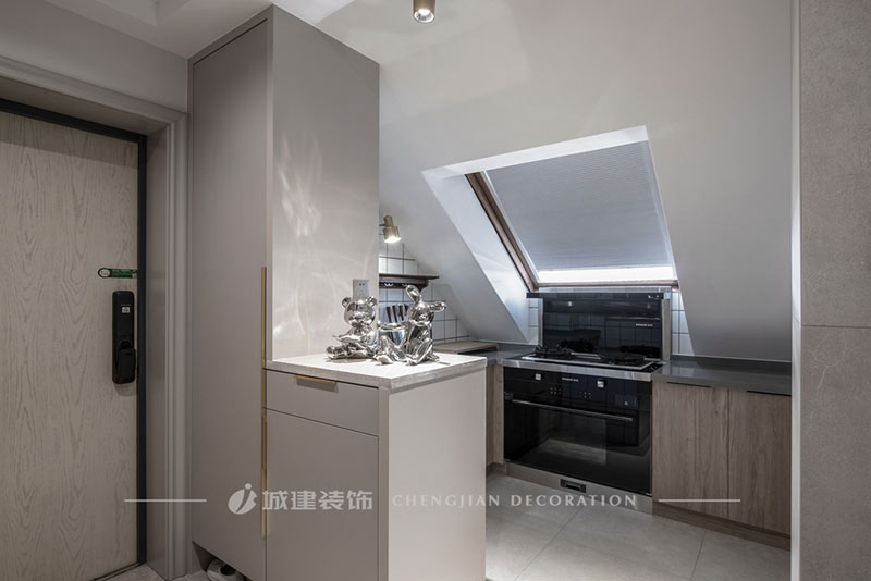 進門左側(cè)設計一高一矮的玄關鞋柜,讓廚房窗外的光線進來,這樣玄關這塊區(qū)域的采光得到了補充。