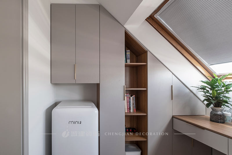 樓梯的位置改變后,空間得到了最大化使用,二樓至此擁有了獨立的書房和主臥套間。